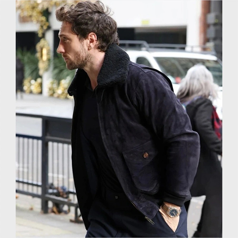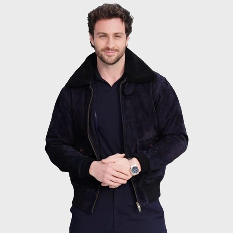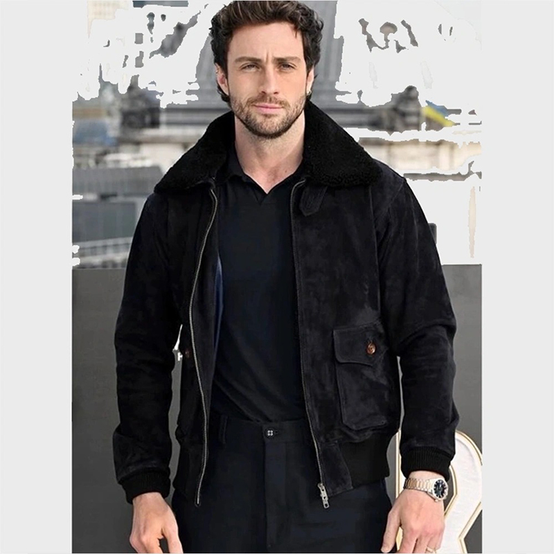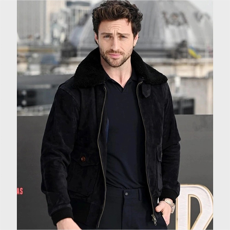 Aaron Taylor-Johnson Black Suede Leather Bomber Jacket with Fur Collar