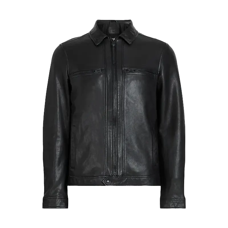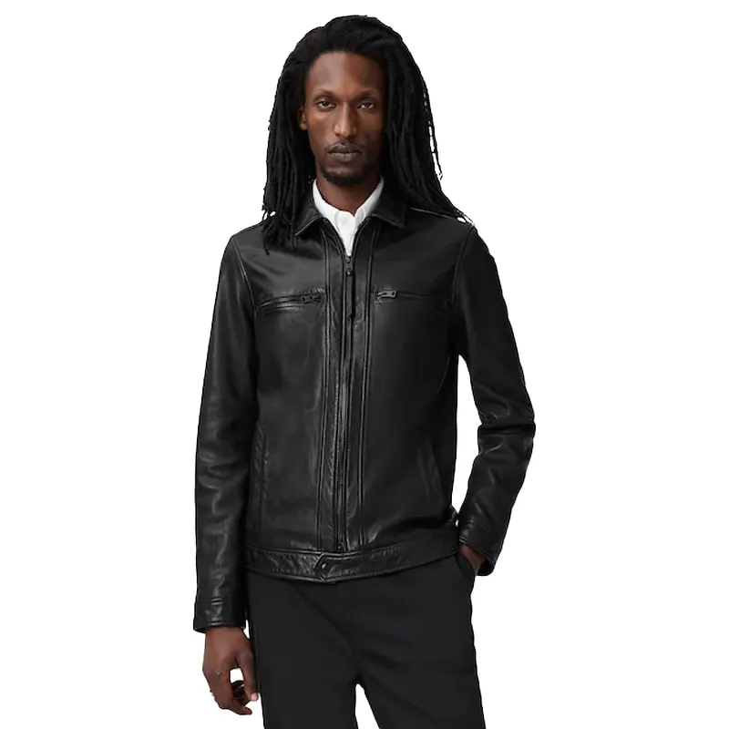 The AllSaints Luck Leather Jacket in black is a modern reinterpretation of a classic silhouette, inspired by archival designs. Crafted from premium washed sheepskin leather, it features matte black hardware and a clean, minimalist finish. This jacket seamlessly blends timeless style with contemporary sophistication.