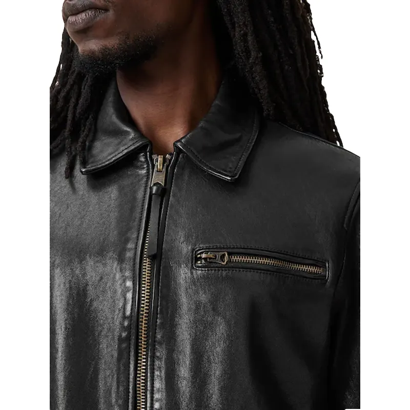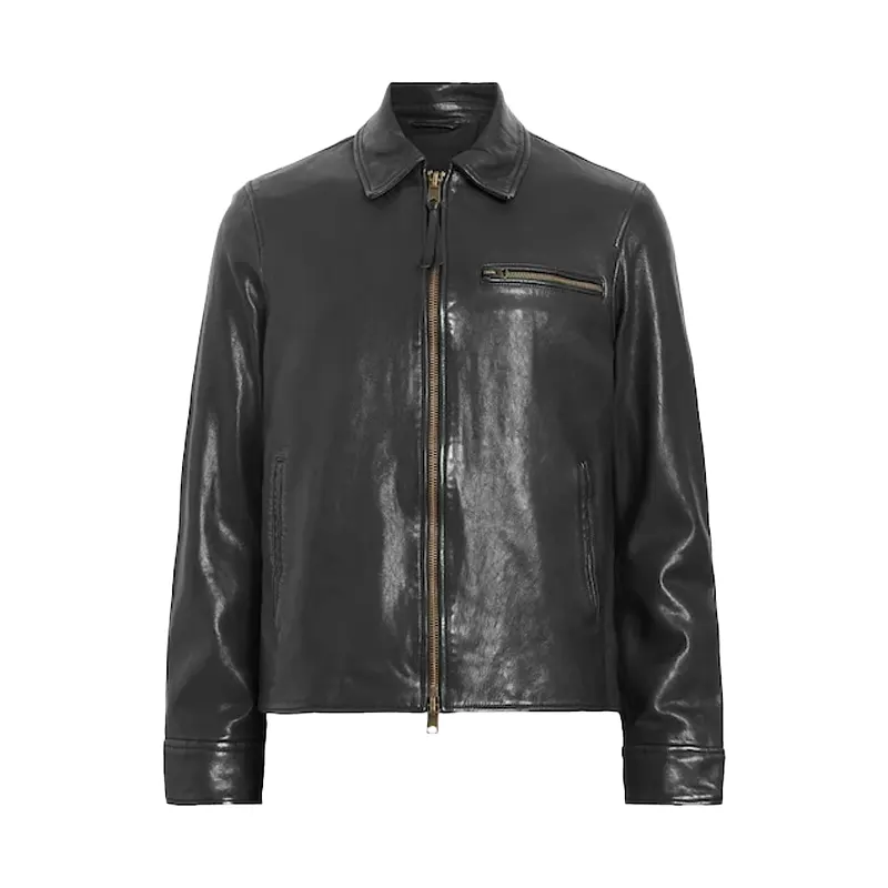 The AllSaints Miller Leather Jacket in black offers a refined take on the classic motorcycle silhouette, blending vintage inspiration with contemporary design. Crafted from premium lamb leather, it features a minimalist aesthetic with antique brass hardware, making it a versatile piece for various occasions. Its regular fit and understated detailing ensure timeless appeal and effortless layering.