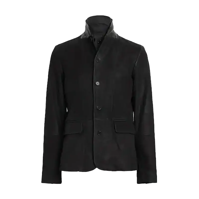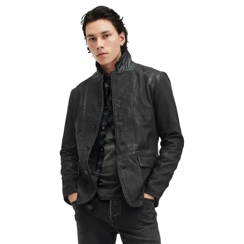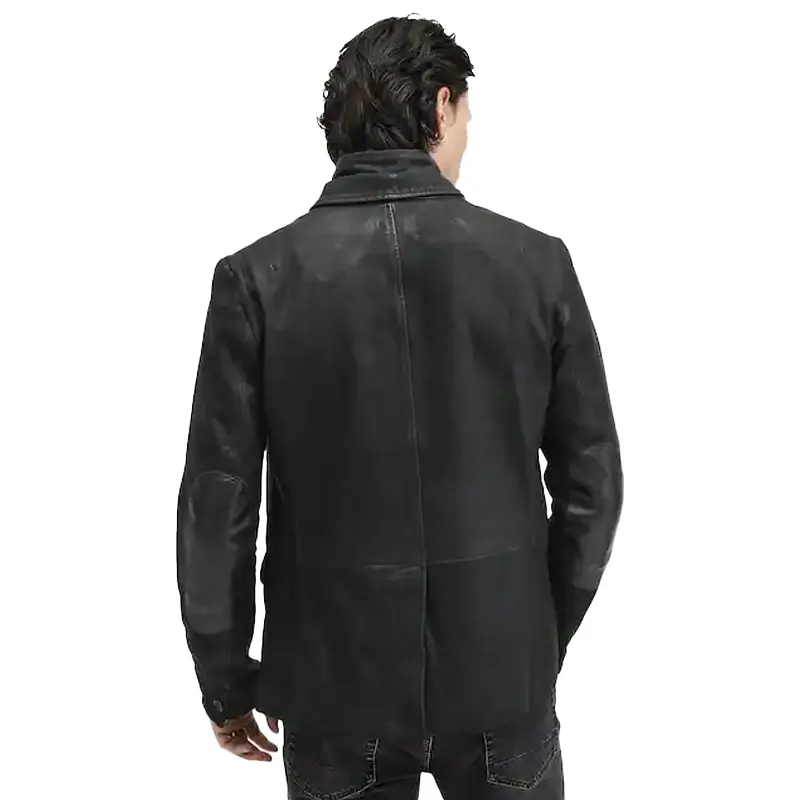The AllSaints Black Survey Leather Blazer is a rugged yet refined piece that elevates casual ensembles with a tailored edge. Crafted from waxed goat suede, it features a distinctive double-layered design with a herringbone wool-blend inner layer, combining sophistication with durability. Leather elbow patches and a structured collar add utilitarian charm, making it a standout addition to any wardrobe.