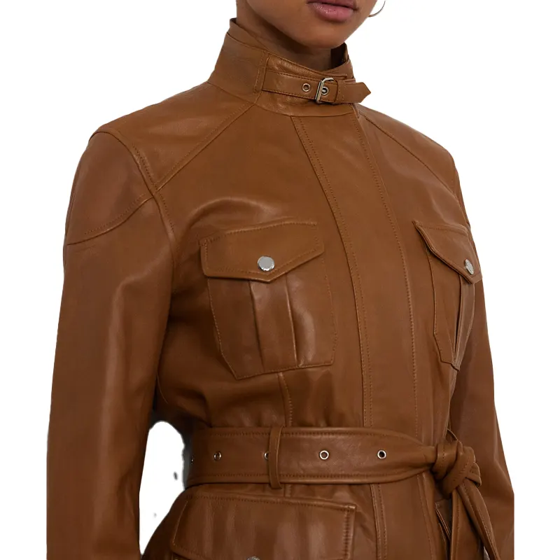 The Belted Lambskin Mockneck Jacket from Lauren Ralph Lauren blends refined tailoring with utilitarian edge. Crafted from supple lambskin leather in a rich Cuoio hue, it features a belted waist and buckled throatlatch for a structured silhouette. Box-pleated patch pockets add functional flair, making it a versatile piece for both city streets and countryside escapes.