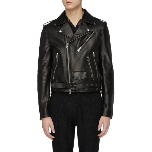 Rev up your style with this bold Men’s Black Asymmetrical Biker Leather Jacket, crafted to deliver both fashion and attitude. Designed with a unique asymmetrical front and a belted waist closure, this jacket exudes confidence and edge — perfect for modern trendsetters and motorcycle enthusiasts alike.