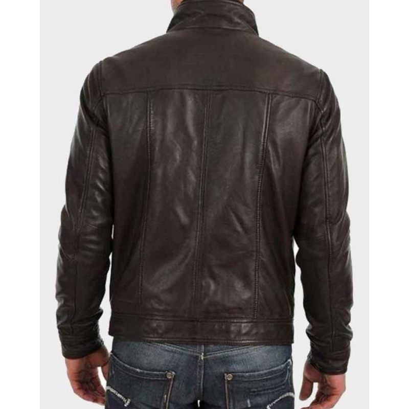Men’s Black Real Leather Cafe Racer Jacket with Buttoned Front