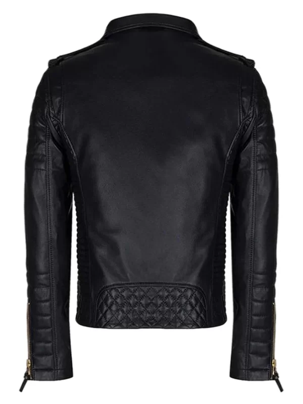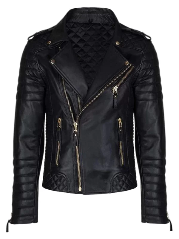 Men’s Black Quilted Leather Biker Jacket with Gold Accents