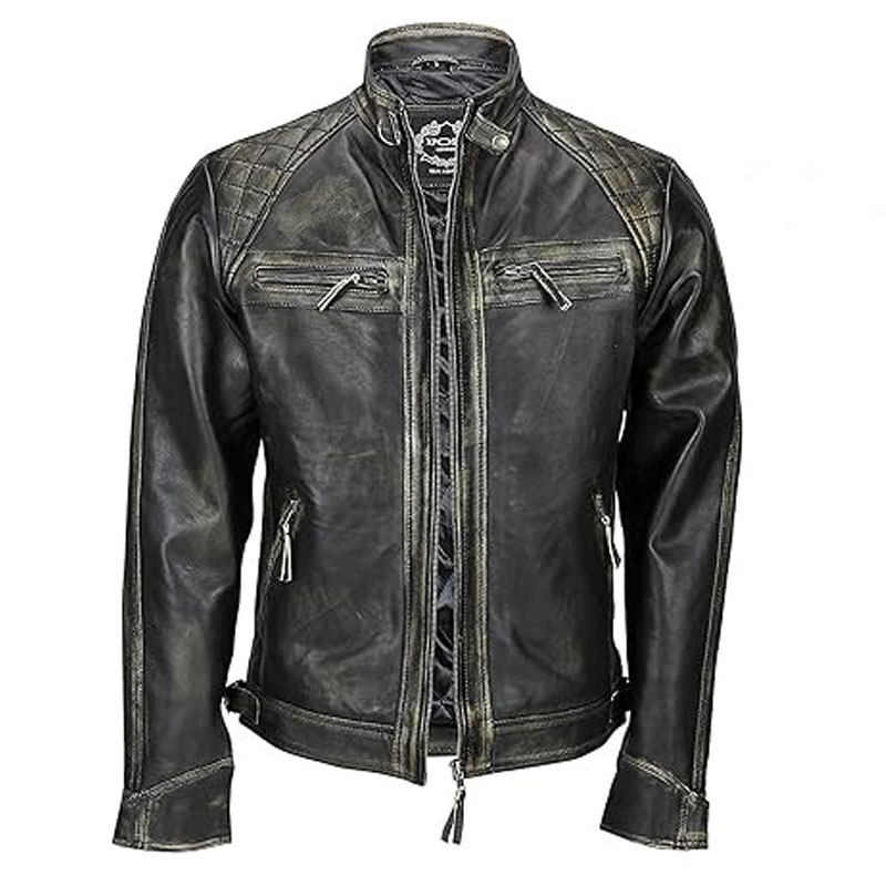 Men’s Vintage Diamond Quilted Shoulders Biker Retro Distressed Cafe Racer Leather Jacket