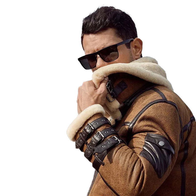 Crafted from premium genuine sheepskin leather and lined with ultra-soft shearling, this jacket is designed to keep you warm in the harshest conditions. The double collar with buckle straps not only enhances the vintage look but also provides extra insulation around the neck. Adjustable cuff straps ensure a snug fit, while the two spacious exterior pockets add practicality to its classic design.