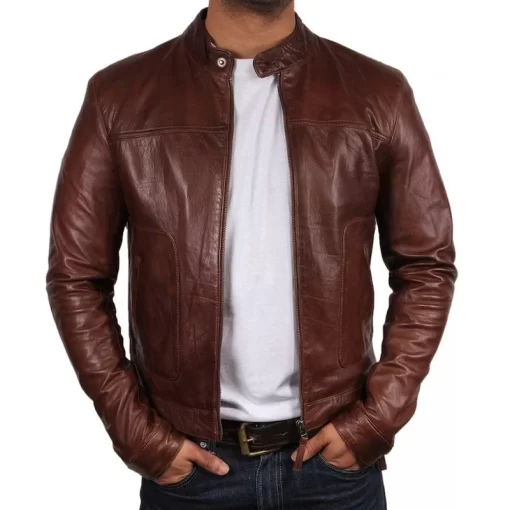 Men’s Brown Sheepskin Leather Bomber Jacket – 100% Genuine Lambskin Cafe Racer Style