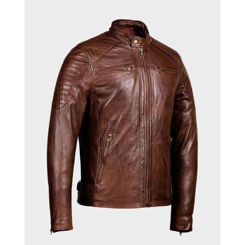 Rev up your wardrobe with this men’s distressed brown Café Racer leather jacket – a timeless blend of rugged attitude and refined craftsmanship. Made from premium Sheep Nappa leather, it offers a soft yet durable feel that molds to your body over time. The quilted polyester lining ensures comfort and warmth, making it suitable for multiple seasons.