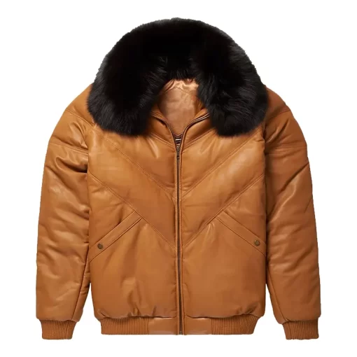 Men’s Camel Brown V-Bomber Leather Jacket with Removable Fox Fur Collar