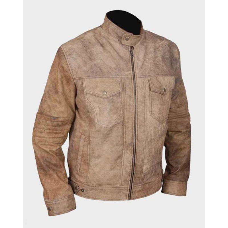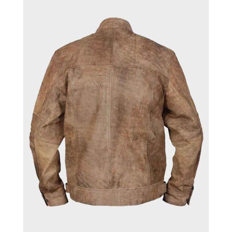 Made from genuine distressed leather, it exudes a vintage appeal while ensuring long-term durability. The interior features a soft viscose lining, offering enhanced comfort and warmth. A stand-up collar with a snap-tab button and a sleek zippered front give the jacket a sharp, structured look.