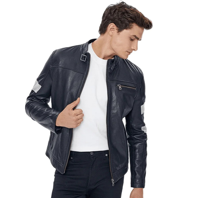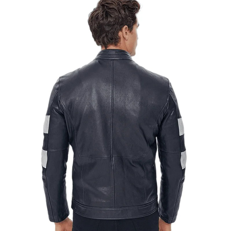 Men’s Black Leather Cafe Racer Jacket with Belted Collar