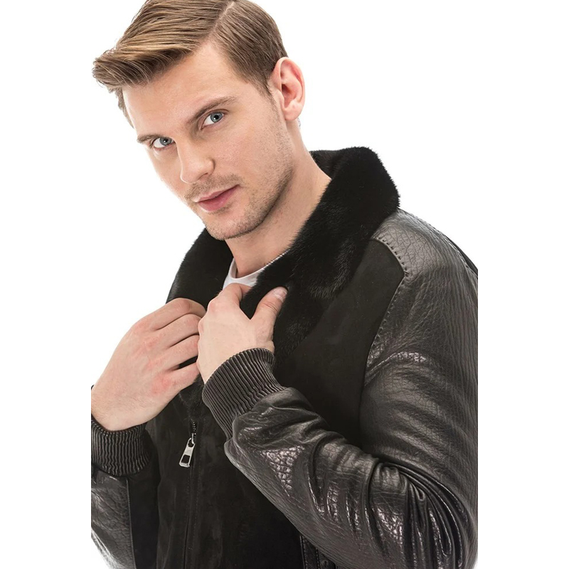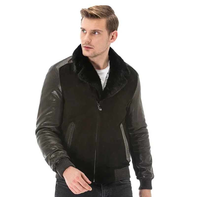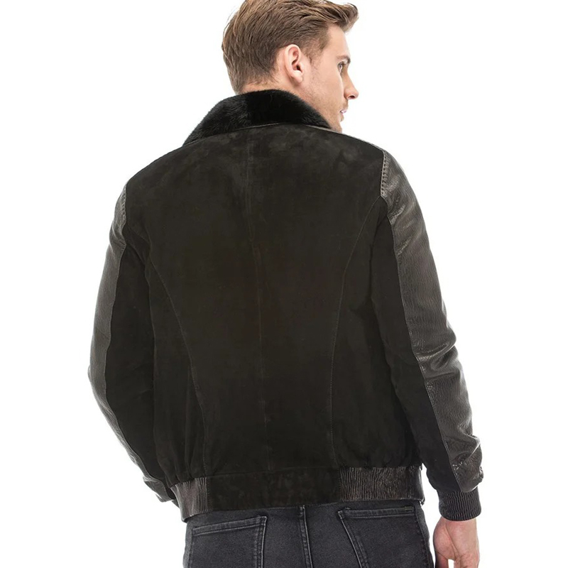 Men’s Premium Black Sheepskin Leather & Suede Bomber Jacket