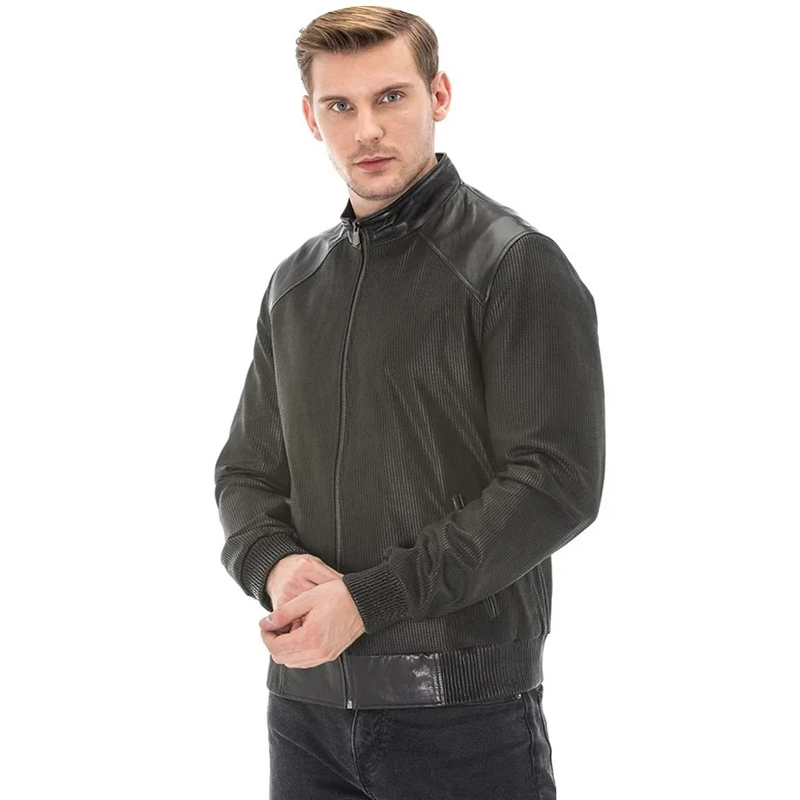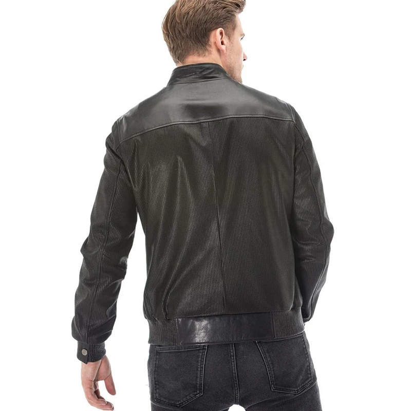 Men’s Real Black Leather Square-Printed Vegetal Jacket
