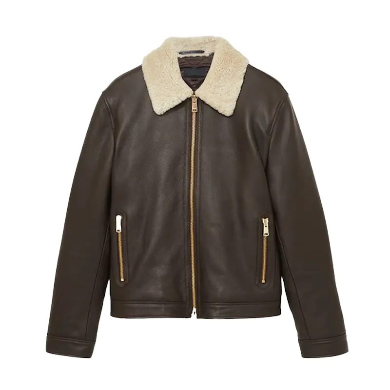 The Men’s Shetland Shearling-Collar Leather Jacket from Reiss is a timeless blend of rugged luxury and refined craftsmanship. Crafted from supple grained leather, it features a plush shearling collar and gold-tone zip accents for a sophisticated touch. Its diamond-quilted lining ensures warmth, making it an ideal choice for cooler climates.