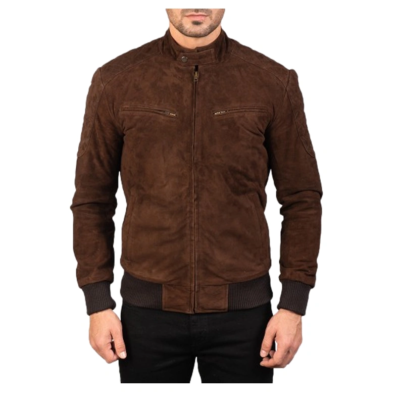 Elevate your outerwear collection with the Men’s Sven Mocha Brown Suede Bomber Jacket. Crafted from premium goatskin leather, this jacket features a luxurious suede finish that adds a sophisticated texture and rich depth to the classic bomber silhouette. The quilted polyester lining ensures all-day comfort and warmth, making it an ideal choice for cooler days. Practicality meets style with a smooth zipper closure, rib-knit cuffs, and a band collar secured with a snap button. Multiple inside and outside pockets provide ample storage for your essentials, while the dark mocha brown color complements any outfit with timeless appeal. Whether you’re dressing up or keeping it casual, this jacket delivers effortless style and durable quality.