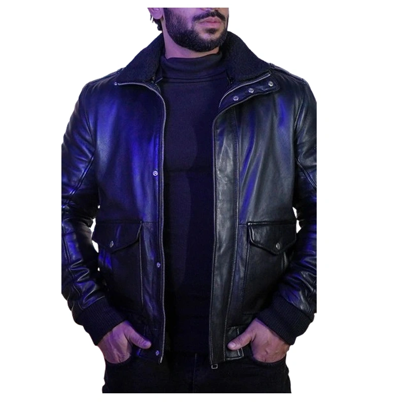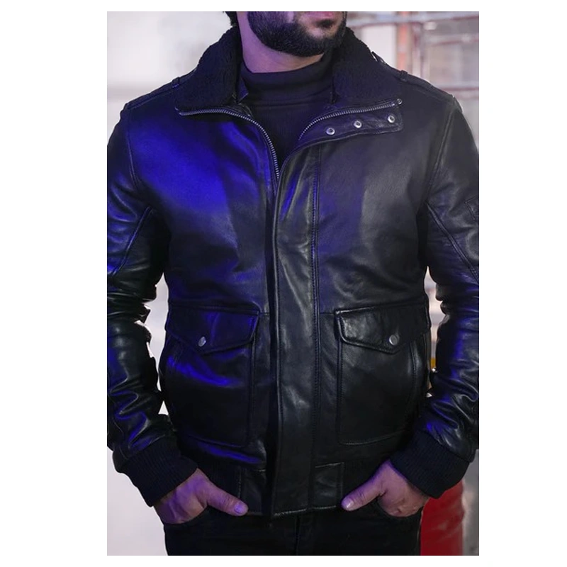 Men’s Vintage Bomber Black Leather Flight Jacket With Fur Collar