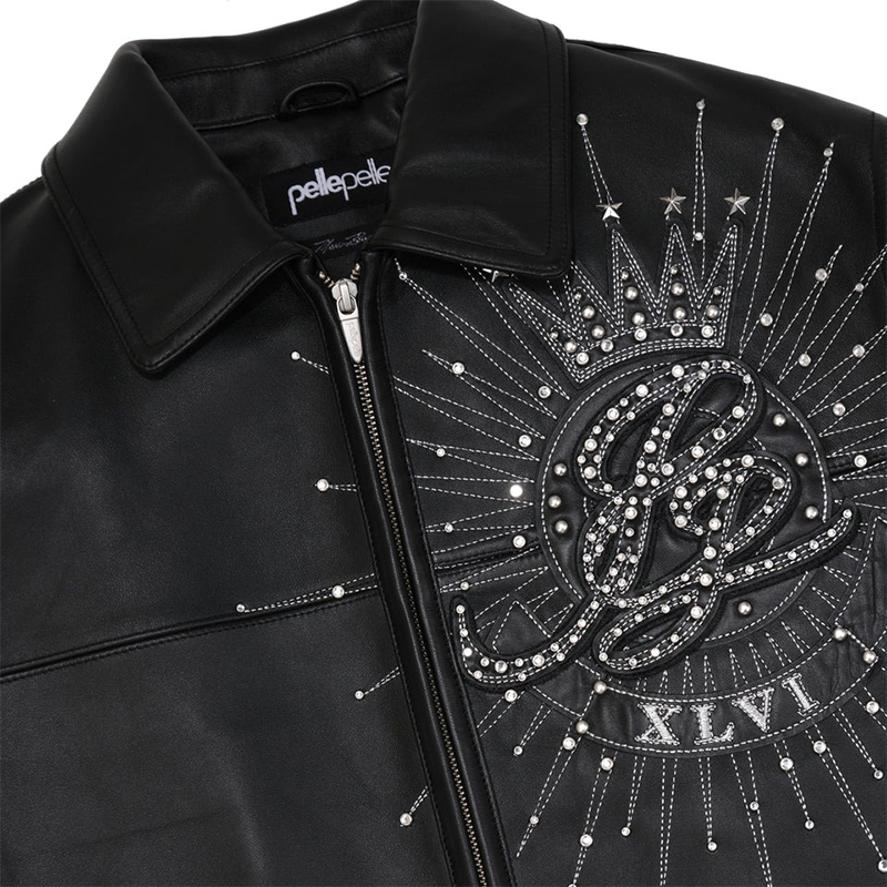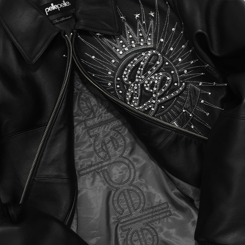 Up front, a sophisticated tone-on-tone leather crown shines with metallic thread and rhinestones, adding subtle luxury. On the back, a commanding leather eagle graphic takes center stage, also adorned with rhinestones to make a bold statement. The custom-branded Pelle Pelle front zipper and leather collar elevate the piece, and ribbed cuffs provide a tailored finish.