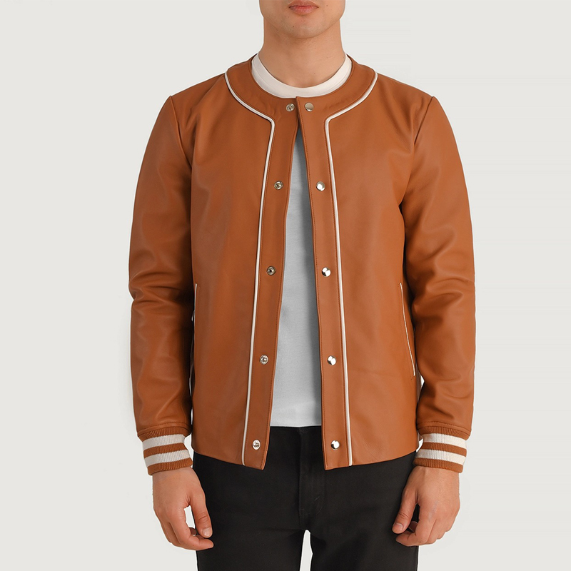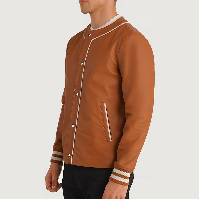 The Willis Tan Brown Leather Varsity Jacket combines classic varsity style with the luxury of premium sheepskin leather. Crafted with a semi-aniline finish, this jacket offers a supple and natural texture that only improves with wear. Its quilted polyester lining ensures warmth and comfort, making it an ideal choice for cooler days. Featuring a sleek collarless design, snap button closure, and rib-knit cuffs, this jacket delivers both style and functionality. Equipped with multiple pockets, it offers practical storage without compromising its clean silhouette. The rich tan brown hue adds a timeless and versatile touch to your wardrobe, perfect for casual outings or elevating your everyday look.
