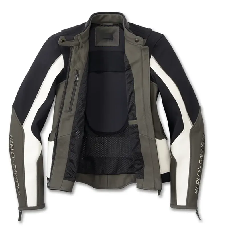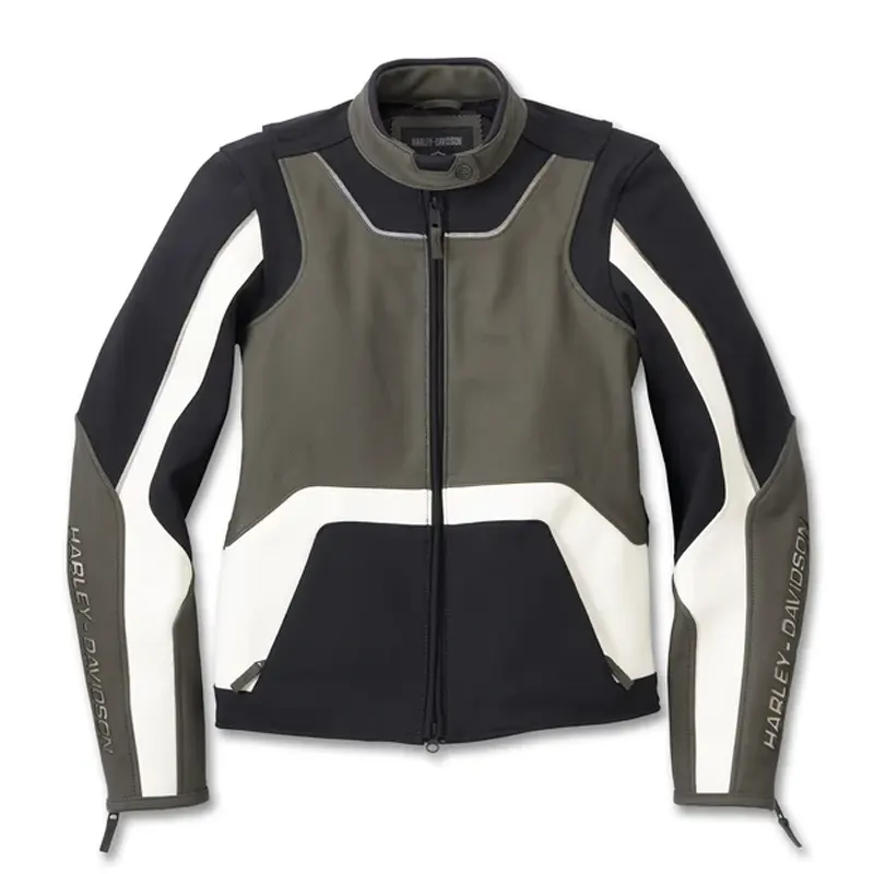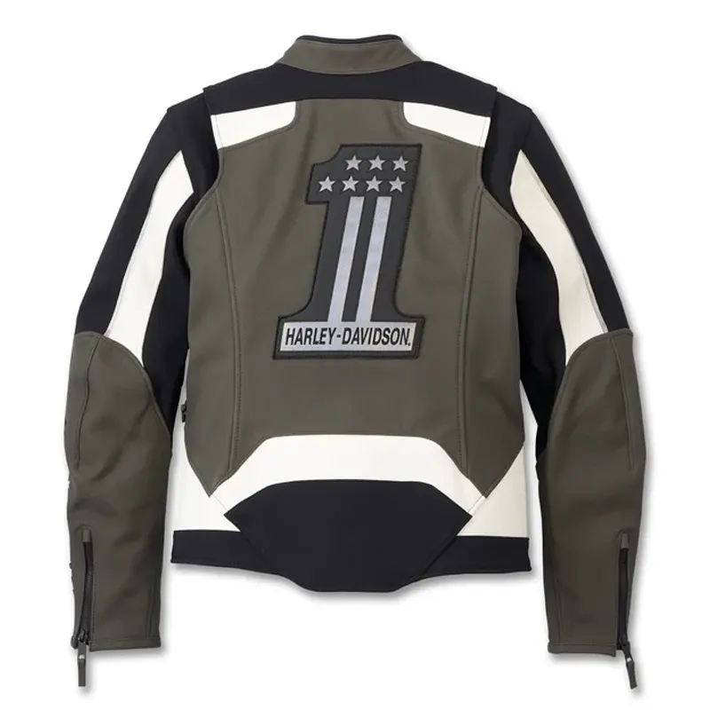 The Women’s Ace Mixed Leather Riding Jacket by Harley-Davidson blends race-inspired aesthetics with practical riding features. Crafted from heavyweight Monaco cow leather and stretch canvas, it offers durability and flexibility. This limited-edition jacket showcases bold colorblocking and a reflective #1 Logo, celebrating Harley-Davidson’s racing heritage.