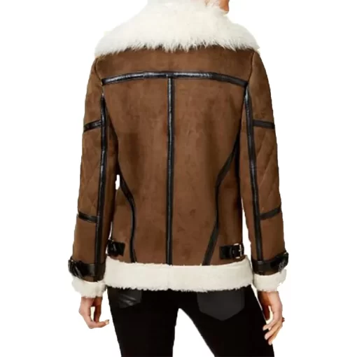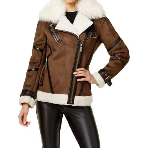 Women’s Brown Asymmetrical Shearling Leather Jacket with Faux Fur Trim