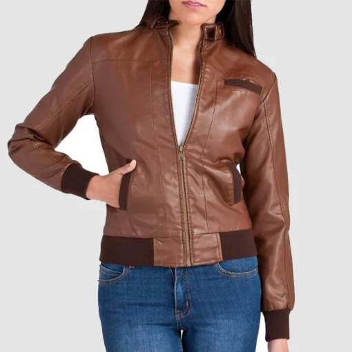 Women’s Coco Brown Faux Leather Bomber Jacket with Quilted Lining