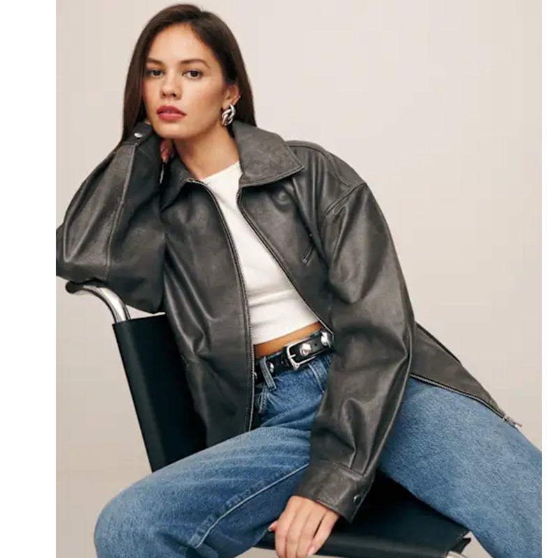 Built for statement style and everyday wear, this oversized bomber jacket combines premium craftsmanship with a vintage edge. The 100% sheep leather exterior is treated with a subtle distressing effect, creating a broken-in finish that feels as soft as it looks rugged. A full polyester lining keeps it comfortable, while oversized zippers, a slanted chest pocket, and welt hand pockets add both function and detail. Snap button cuffs and waist provide a secure fit, and brushed silver hardware completes the jacket with a bold, timeless touch.