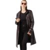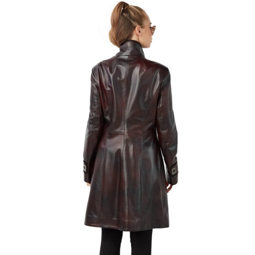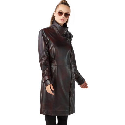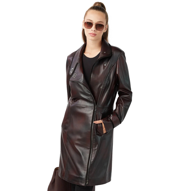 Women’s Claret Red Genuine Lambskin Leather Trench Coat – Double-Breasted, Asymmetrical Zip, Studded